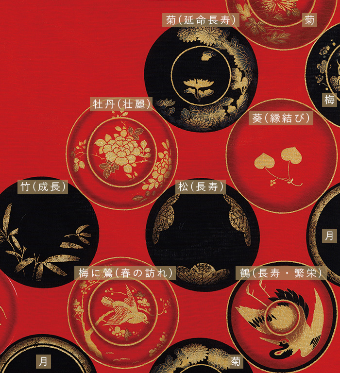 金や銀で吉祥のモチーフが描かれた漆のお椀を並べたデザインです。色の濃淡や金の顔料を工夫して、実際の椀に描かれている蒔絵や金彩を出来る限り再現しています。生地が固くなるため、金の量を調整しながら手触りや結びやすさも追求しています。