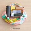 Mサイズのふろしきでバッグを作ると、ハンドバッグ位の大きさになり、貴重品や水筒、メモ帳なども入ります。Lサイズは上着をいれたり、買い物バッグにすることができる大きさです。