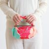Sサイズ(45~50cm)のふろしきでバッグを作ると、クラッチバッグ位の大きさになり、財布と携帯、リップなどが入ります。また、お弁当箱を入れるバッグとしても程よい大きさです。