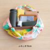 Mサイズ(68~70cm)のふろしきでバッグを作ると、ハンドバッグ位の大きさになり、貴重品や水筒、メモ帳なども入ります。Lサイズは上着をいれたり、買い物バッグにすることができる大きさです。
