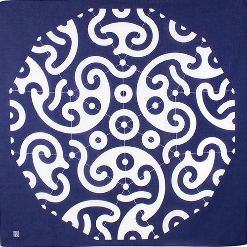 美術家 野老朝雄氏とMUSUBIが共同開発したふろしきです。野老氏の代表的な紋様であるPPP紋様(Piecing Pieces Pattern)は、ピース同士を隣り合わせると、どの方向にも唐草紋様が繋がります。同じピースの組合せを変えることで、左右対称(グレー)と回転対称(紺)の2つのデザインを生み出しました。
