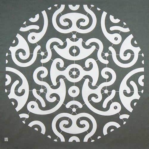 美術家 野老朝雄氏とMUSUBIが共同開発したふろしきです。野老氏の代表的な紋様であるPPP紋様(Piecing Pieces Pattern)は、ピース同士を隣り合わせると、どの方向にも唐草紋様が繋がります。同じピースの組合せを変えることで、左右対称(グレー)と回転対称(紺)の2つのデザインを生み出しました。