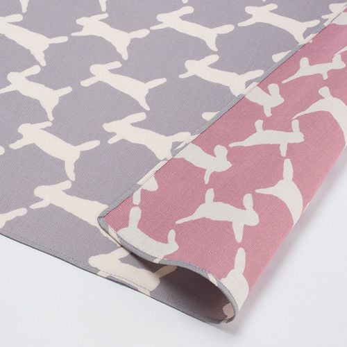 生地には、ふっくらとしたやわらかさが魅力のコットンガーゼを使用し、表面は細かい凹凸感が出るアムンゼン織り、裏面はガーゼ織りに仕立てました。二つの組織を組み合わせることで、やさしい手触りを保ちながらも、ふろしきとして安心して使える丈夫さを兼ね備えています。