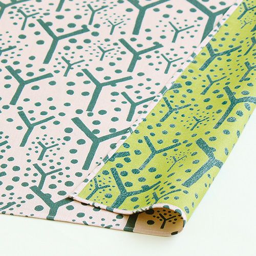 むす美の特徴でもある両面染めの技術とミナのデザインが融合したシリーズです。現在では非常に希少となった「ロール捺染」という染色機を使い、柄部分に着色防染で蓋をした後、表・裏それぞれを無地染めするという独自の工程によって生まれます。手間を惜しまない高度な技術が生み出す、奥行きのある風合いを生み出しています。