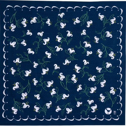 ゆりのはらはらと舞う姿が、ノスタルジックで可憐な夢二の世界観を表しています。原画の図案では、赤い背景に白1色でゆりが描かれていますが、ふろしきでは包んだ時の見え方まで考慮したモチーフの配置や、和洋のファッションやインテリアにも溶け合うカラーリングにこだわりました。生地感に奥行きを出すために地紋としてドットをいれています。ゆりは、4月~8月の夏の時期に開花、白い百合の花言葉は「純潔」「威厳」「無垢」「無邪気」「甘美」とされ、ウェディングブーケとしても使用されます。また、女性の美しさを形容する「立てば芍薬、座れば牡丹、歩く姿は百合の花」の慣用句でも使われ、女性へのギフトにもおすすめです。