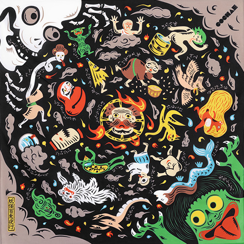 百鬼夜行をテーマに、妖怪たちがグルグルと練り歩いている姿をイメージしたデザインです。妖怪たちは、コチャエのユニットメンバーが、全員で書き入れています。
