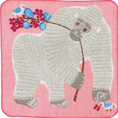 森に住むやさしいゴリラをイメージしています。散歩するゴリラについていく小鳥たちは、仲が良いのか木の実を狙っているのか…。