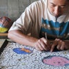 デザインから染色まで多くの工程を手作業で行い、手仕事の温かみのある作風が特徴です。むす美とのコラボレーションでも、その持ち味は顕在で、型絵染の工程と同じく、モチーフは手作業で型紙から彫り出しています。