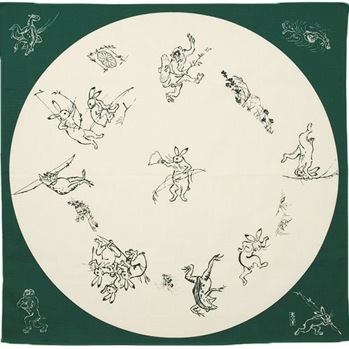 鳥獣人物戯画は、京都の栂尾山高山寺に伝わる紙本墨画の絵巻物です。その内容は、当時の世相を反映して動物や人物を戯画的に描いたもので、風刺漫画の祖と云われています。800年の時を経て、兎や猿、蛙たちが、ふろしきの上を活き活きと駆けまわり、当時の息吹を伝えてくれます。