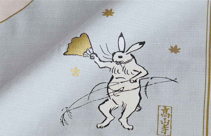 国宝「鳥獣人物戯画」は、京都の高山寺に伝わる紙本墨画の絵巻物です。漫画の元祖ともいわれ、卓越した筆さばきで描かれた愛嬌のある動物たちは、時代を超えて今日でも人気を博しています。デザインはピンクとブルーで異なり、それぞれのメインのモチーフは、鳥獣人物戯画の中でも人気の高い「猿追い」と「相撲」が描かれています。ハンカチを4つ折りに畳んだ時、そのシーンが綺麗に現われます。