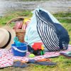 きらきらと輝く海を泳ぐクジラの様子です。背景はうねりのあるストライプで包んだ時のアクセントになります。kata kataシリーズで人気のあるデザインです。