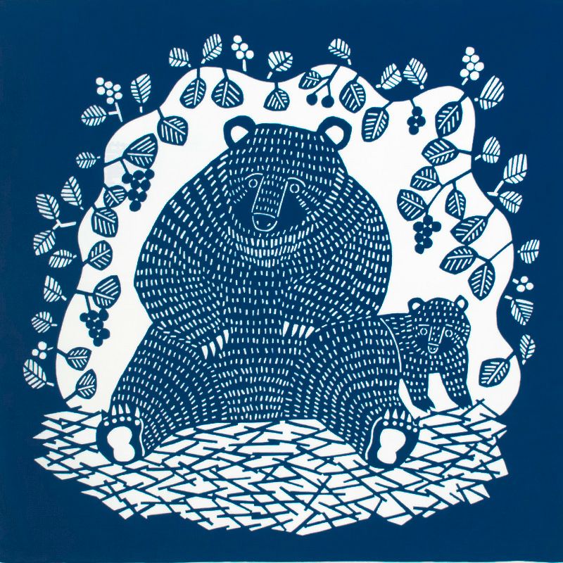 森の中がふわふわの葉っぱに包まれる季節、クマの親子の寝ぐらを覗いてみました。クマの毛並みの線の入れ方や彫り方にこだわり、丸みのあるふくよかなクマの親子が描けました。