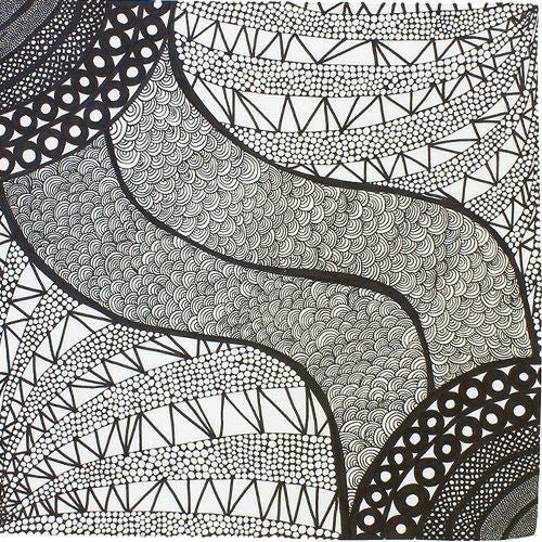 長方形の作品を正方形にアレンジする過程で、手描きで描いたように緩やかなラインで描かれているグレーのフチを加えました。包んだ時にアクセントになります。