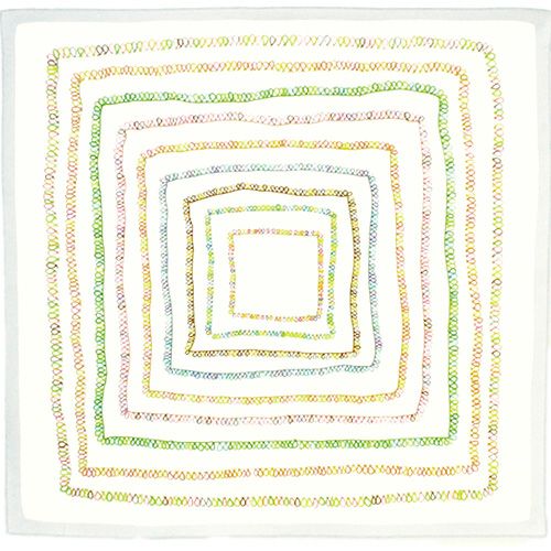 優しさや可愛らしさをテーマに描かれた本作品は、何色もの色鉛筆でひとつひとつ描かれた無数の丸いラインが大きな模様を作り出しています。温かなぬくもりを感じる作品です。