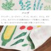 ラベンダー、ローズマリー、ディル、オレガノ、タイム、ゼラニウム、などリラックス効果のあるハーブが瑞々しく描かれています。見ているだけでさわやかな香りが漂ってきそうです。
