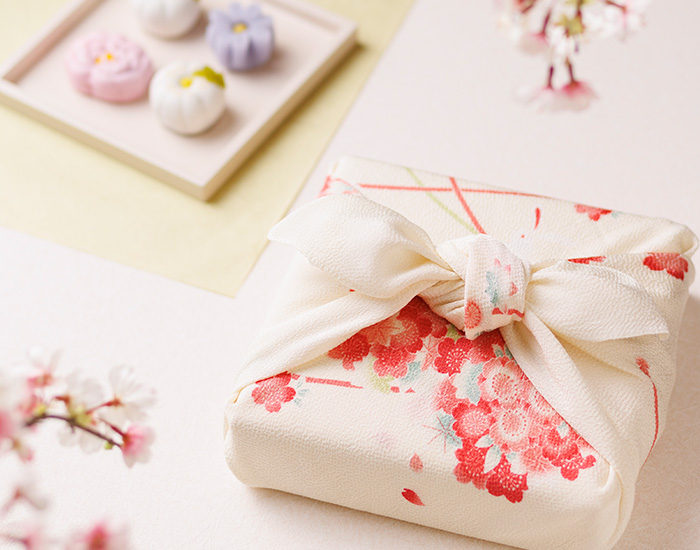 ちりめん生地は、シワになりにくく、多少の伸縮性があるため結びやすく、ラッピング用のふろしきとして人気があります。また、70cmサイズは、菓子折りやワインなどの手土産を包むのにも最適です。