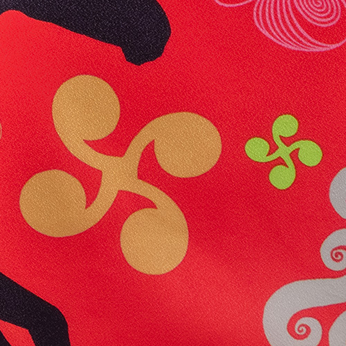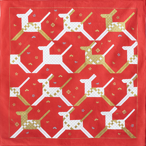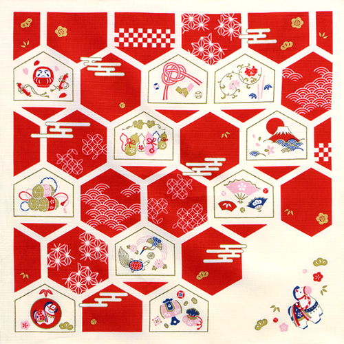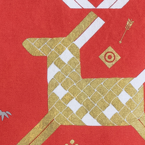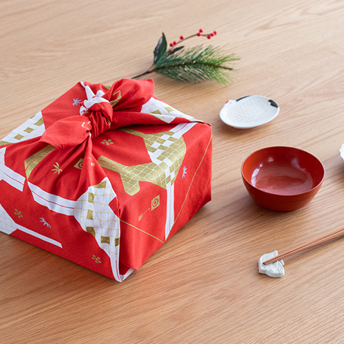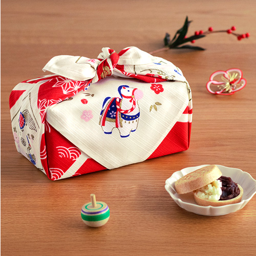 新年を華やかに迎える、めでたい色と縁起モチーフをふんだんにあしらった干支ふろしきです。楽しく明るい1年になるように願いを込めていますので、年始のお配りものにも最適です。