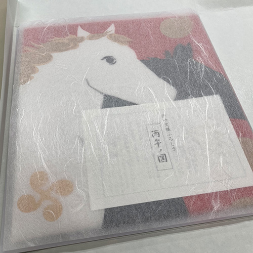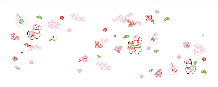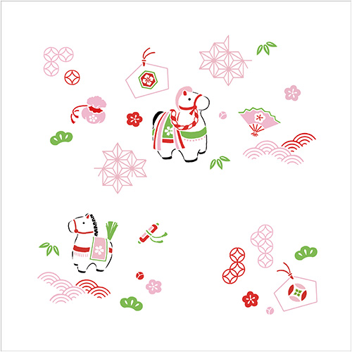 神馬と縁起物のモチーフ、吉祥文様を組み合わせ、新年を迎えるに相応しいおめでたい雰囲気に仕上げました。神馬のかたちは張り子をモチーフに、親しみやすいイメージに仕上げています。周囲には吉祥文様や縁起物が描かれています。パッケージ入りのため、お配り物に最適です。