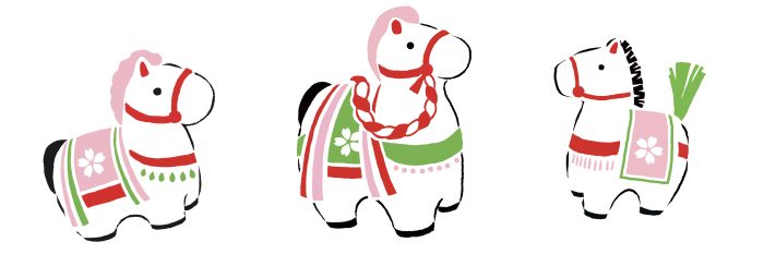 馬のシルエットの形は、それぞれ日本の郷土玩具や民芸品をモチーフにしています。