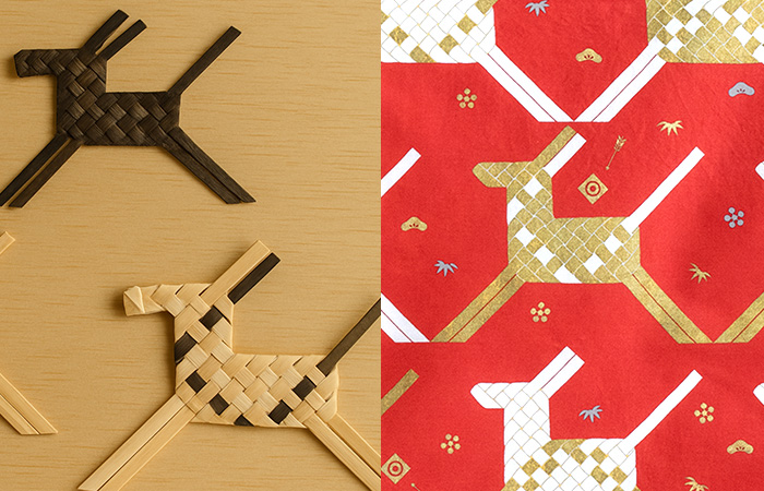 秋田県の伝統工芸イタヤカエデで作られた郷土玩具「イタヤ馬」を並べて配置して、幾何学模様にも見えるレイアウトに仕上げました。長寿・高潔・出世を象徴する“松竹梅”や、天下泰平・五穀豊穣・病気平癒を祈念する“流鏑馬”も入っていて、広げても包んでも楽しいデザインです。