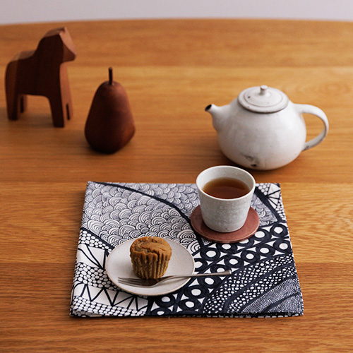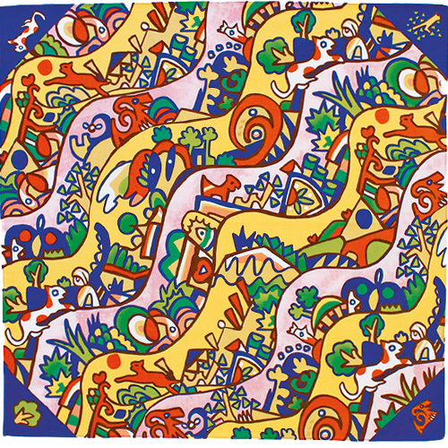 原画はボーダー状にくねくね模様が描かれていますが、ふろしきとして使用した時にボーダー状になる様、向きを斜めにアレンジしています。