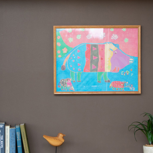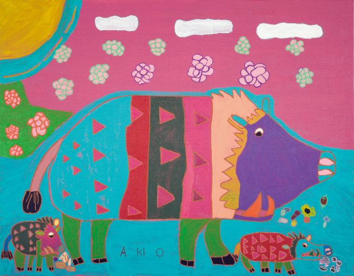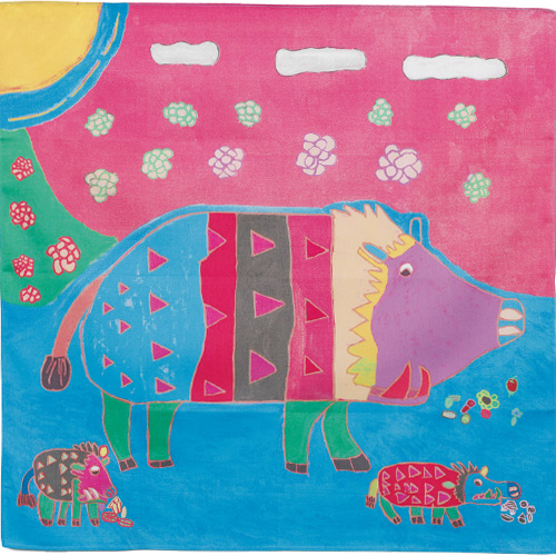 鮮やかに彩色されたいのししの親子の姿が実に愛らしい作品です。1 枚の絵としての素晴らしさだけでなく、ふろしきとして包んだ際に効果的な背景やモチーフの配置にも注目です。