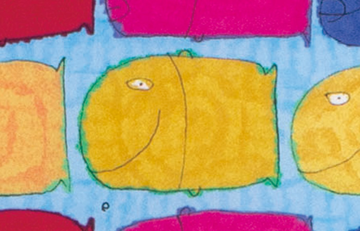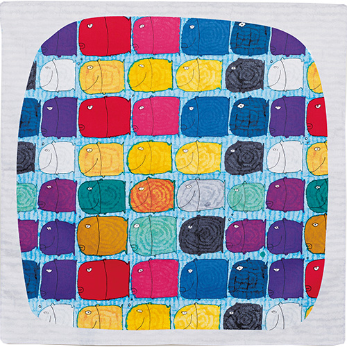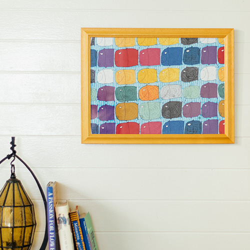 動物や魚、昆虫などの生き物が大好きな作者が、魚を好きな気持ちを表現した作品です。作者が動物園や水族館へ行くのが好きという事を知り、周りにフチを付けることで水族館の窓から魚の群れを覗いているようなデザインにアレンジしています。シリーズでも最多の15 色を掛け合わせて染められています。