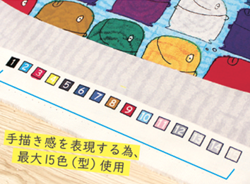 手描き感を表現しながらもコストを抑えられるよう、1 色1型で染めるオートスクリーンを採用しながらも色を掛け合わせることで可能な限り原画の手描き感を再現しました。デザインによっては最大15型を使い、原作のタッチの再現に挑みました。