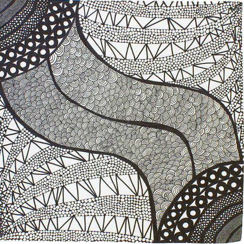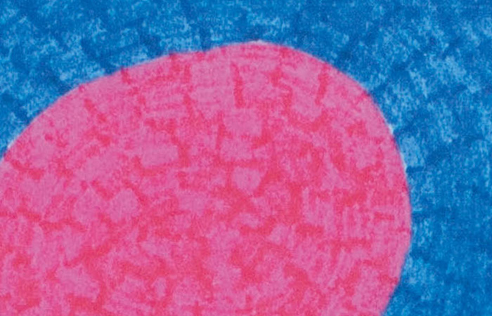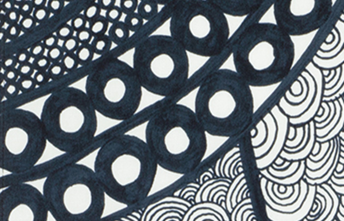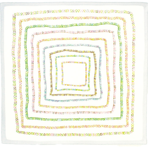 優しさや可愛らしさをテーマに描かれた本作品は、ひとつひとつ描かれた無数の丸いラインが大きな模様を作り出しています。何色もの色鉛筆で描かれたぬくもりのある作風です。色鉛筆を何色も使って描き出されたラインを写真製版の技術を使って再現しました。