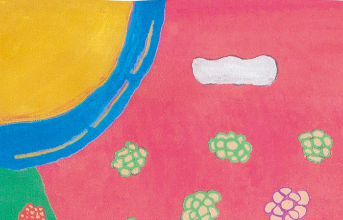 幼稚園の頃、お日さまがよく当たる小さな砂場で、みんな一緒に安心して遊んだ思い出を描いたものです。何かに暖かく包まれていたように感じた気持ちを表現しています。一筆一筆、丁寧にペンで余白を生めるように描かれたタッチを出来る限り再現しています。合計11 色を掛け合わせた高度な技術の染色で表現しています。