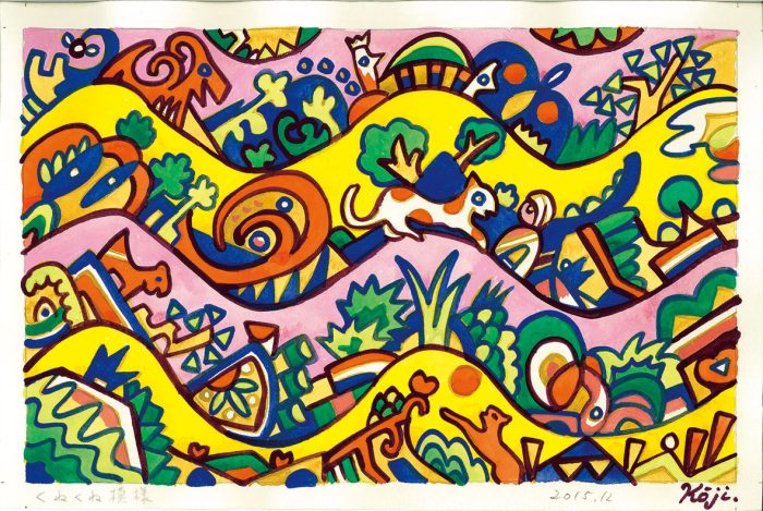 「くねくね」という言葉からイメージして描かれた作品です。登場する動物たちも猫以外は「くねくね」という言葉の響きから思い浮かんだ想像上の動物です。