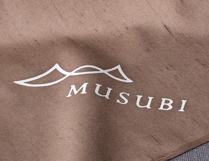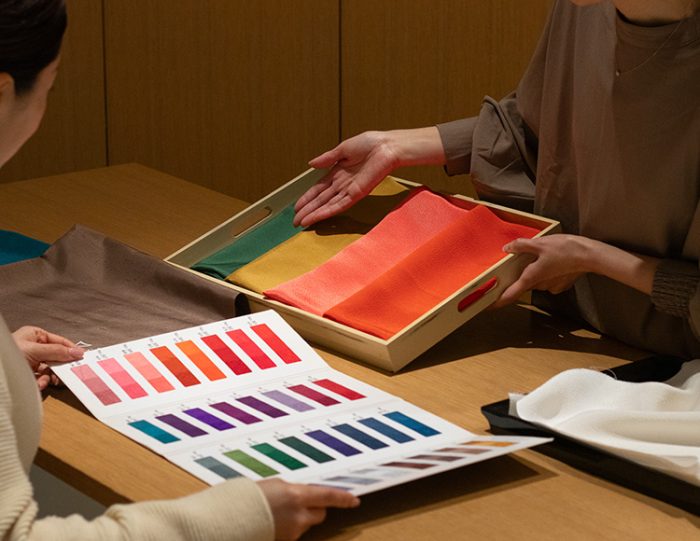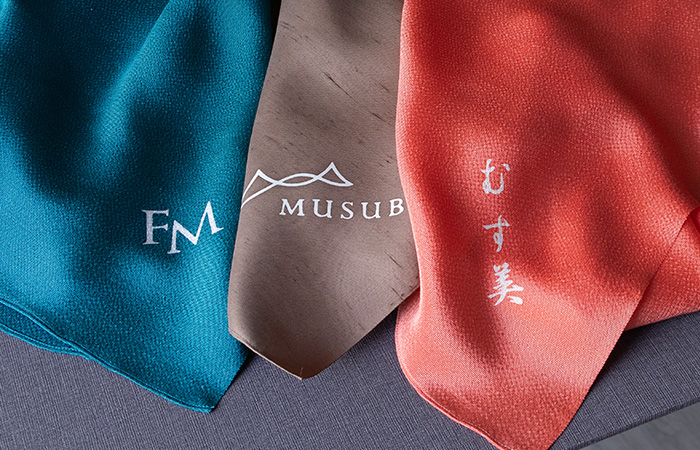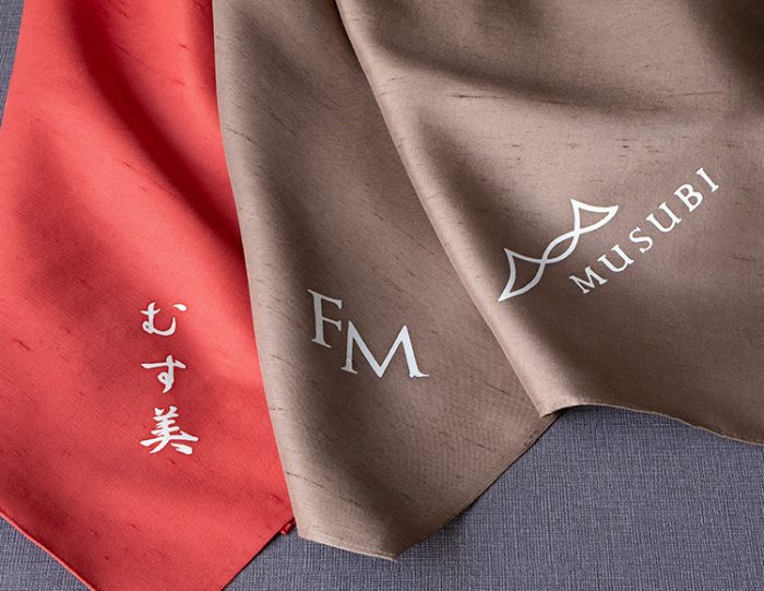 むす美では、「真っ白な正絹(シルク)から“自分だけのふろしき”をつくる。」プレミアムなサービスをご提供しております。約32種の伝統色からお好みの色をお選びいただき、京都の熟練職人が一枚ずつ丁寧に染め上げて完成いたします。