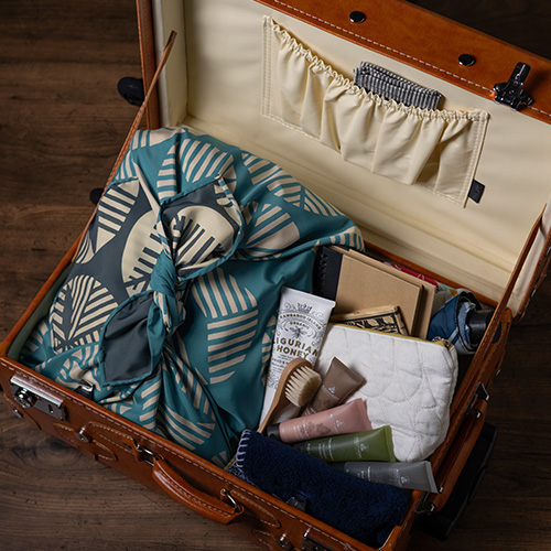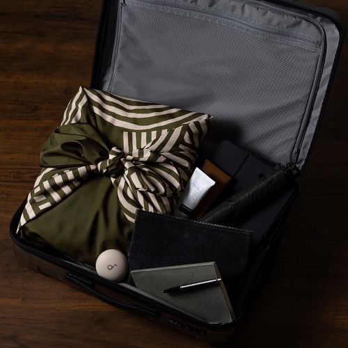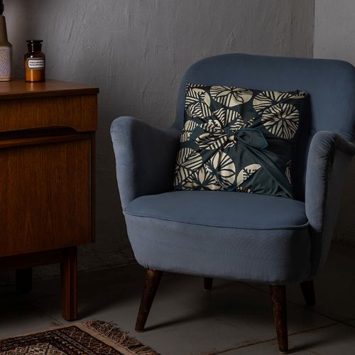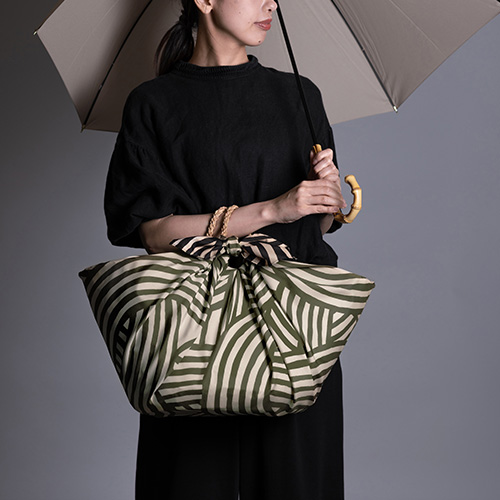 これまでの伊砂文様のふろしきよりも大きなデザインを取り入れ、さらに柄の中に余白を持たせることにより、平面の時と包んだ時の印象の変化をお楽しみいただけるように仕上げました。ファッションやインテリアにも馴染みやすいよう、シックなカラーリングでアート感漂う1枚です。