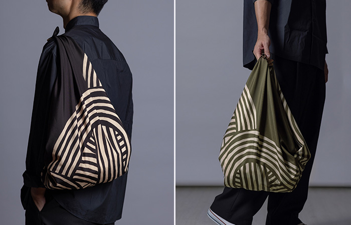 結の文様を今までよりも大きく使い、平面と包んだ時の立体とで見え方の変化を持たせるため、ふろしきの左側に余白を作っています。また綿素材の結と異なり、高級感と男性も使いやすいように黒っぽい色のテツグロと濃いカーキ色のようなリキュウの2色で染め上げています。