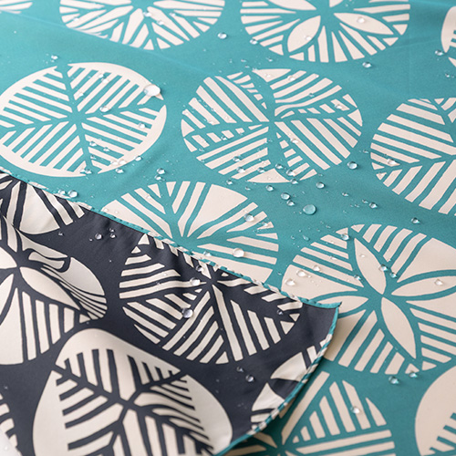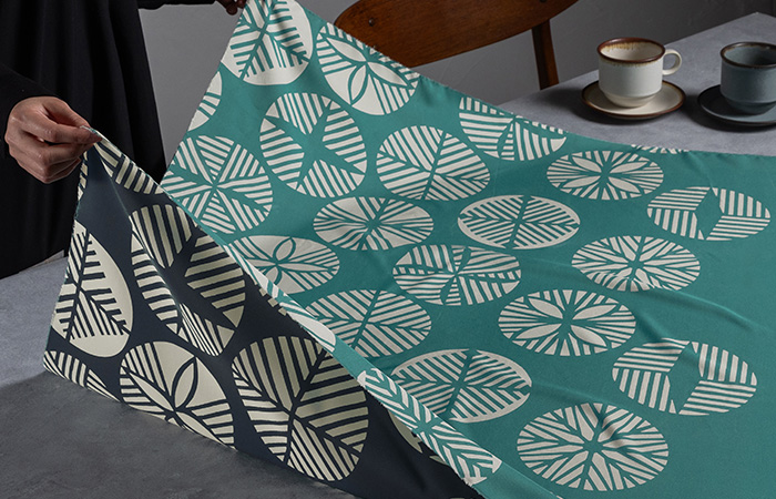 裏表で別々のモチーフではなく、同じ位置にあるモチーフを違う色で染める方法は他に類を見ない技術です。何度も失敗を繰り返し、試行錯誤を重ねた末に完成したこのシリーズは、私たちにとっても商品化できるのかわからないチャレンジでした。薄手のポリエステル生地を両面染めし、撥水加工を施した“伊砂文様 両面 ”のアクアドロップは非常に手間をかけて完成したむす美ならではふろしきです。