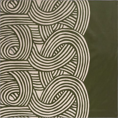 元になった図案は、日本の伝統的な染色方法である型絵染めの為に作られました。柿渋の型紙を刀で彫り抜いて形成されるので手仕事ならではの不均一な太さのラインが生まれ、味わい深い趣を感じます。どこまでもつながって途切れないことから縁起が良いといわれています。
