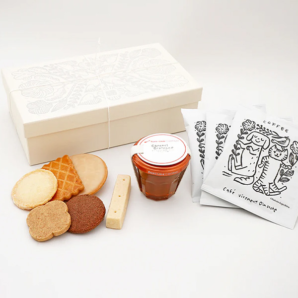 鹿児島睦さんデザインのオリジナルボックスに、romi-unieの定番サブレ6種類、そして焼き菓子にぴったりなオリジナルブレンドのカップオンコーヒー、定番人気のジャムの詰め合わせ。