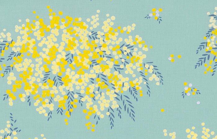 やさしいミントカラーにミモザの花が軽やかに広がる、明るくやわらかな印象の一枚