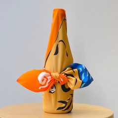 【ビン1本包み】は、仕上げを真結びにするかねじるかで、ぐっと雰囲気が変えられます。約70cmのふろしきなので、ワインボトルや日本酒の四合瓶が包めます。今度は、トラがねじり鉢巻きをしているようです♪