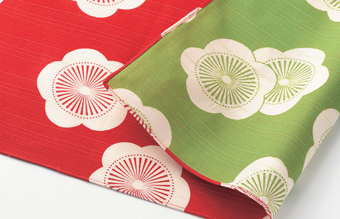 伝統的な色・柄でありつつ、包むと紅白や紺白のコントラストがモダンで華やいだ印象を与えるデザイン。広げると「梅」や「千鳥」「亀甲」など包んでいる時には思いもしなかったモチーフが現れ、変化を楽しめるのも人気の理由です。