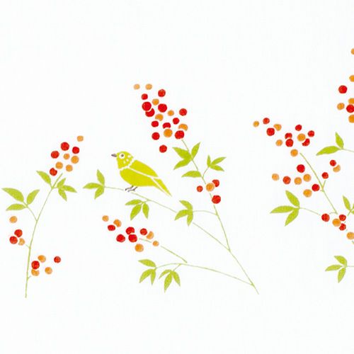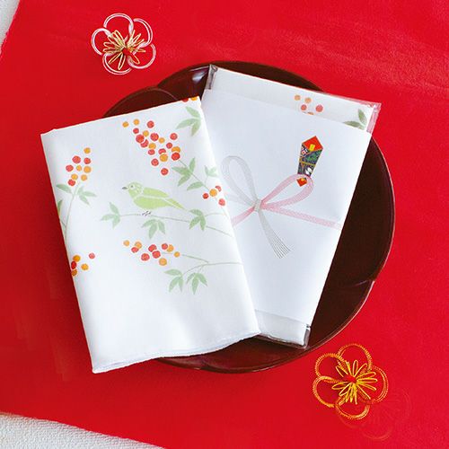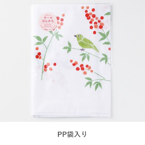 ガーゼはんかち【袋入】 南天と鳥 オレンジ